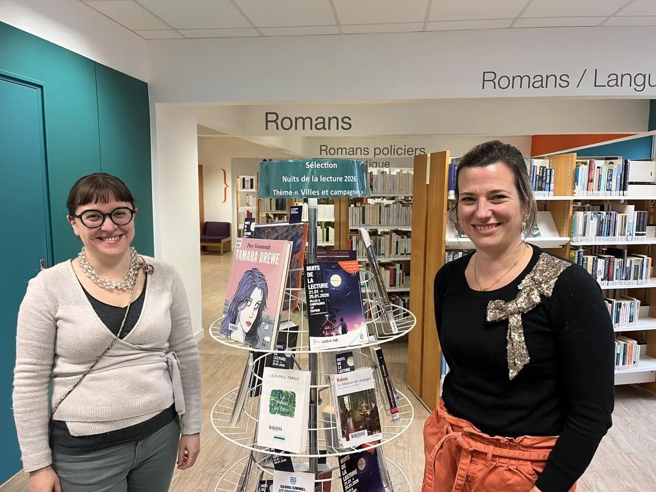 Gwenaëlle Hubert, coordinatrice du réseau, et Hélène Dupont, directrice de la bibliothèque de La Flèche (Sarthe), présentent les Nuits de la lecture. Des animations gratuites organisées du mercredi 21 au samedi 24 janvier 2026 dans le Pays fléchois. © Ouest-France.