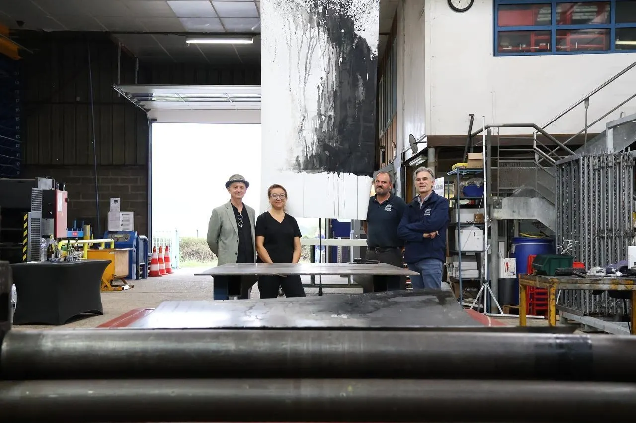 Le galeriste Éric Dos Santos, l’artiste Danielle Burgart, le compagnon artisan Lionel Chesneau et le patron des Ateliers Dabin Vincent Masson posent au pied de l’œuvre créée avec une presse de plus de 100 ans, vendredi 3 octobre 2025. © Ouest-France