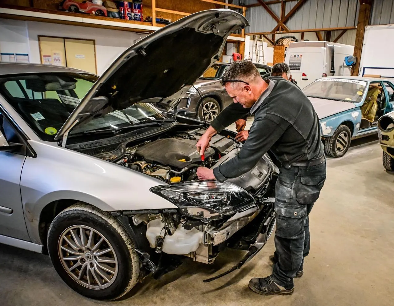 Carrosserie de La Pelouse, à Tuffé-Val-de-Chéronne, un après-midi de décembre 2025 : quelques-unes des voitures abîmées par des chocs l’ont été par des animaux sauvages. Des sangliers en particulier, dont les populations, en fonction des secteurs, augmentent, dans la Sarthe, comme ailleurs.
