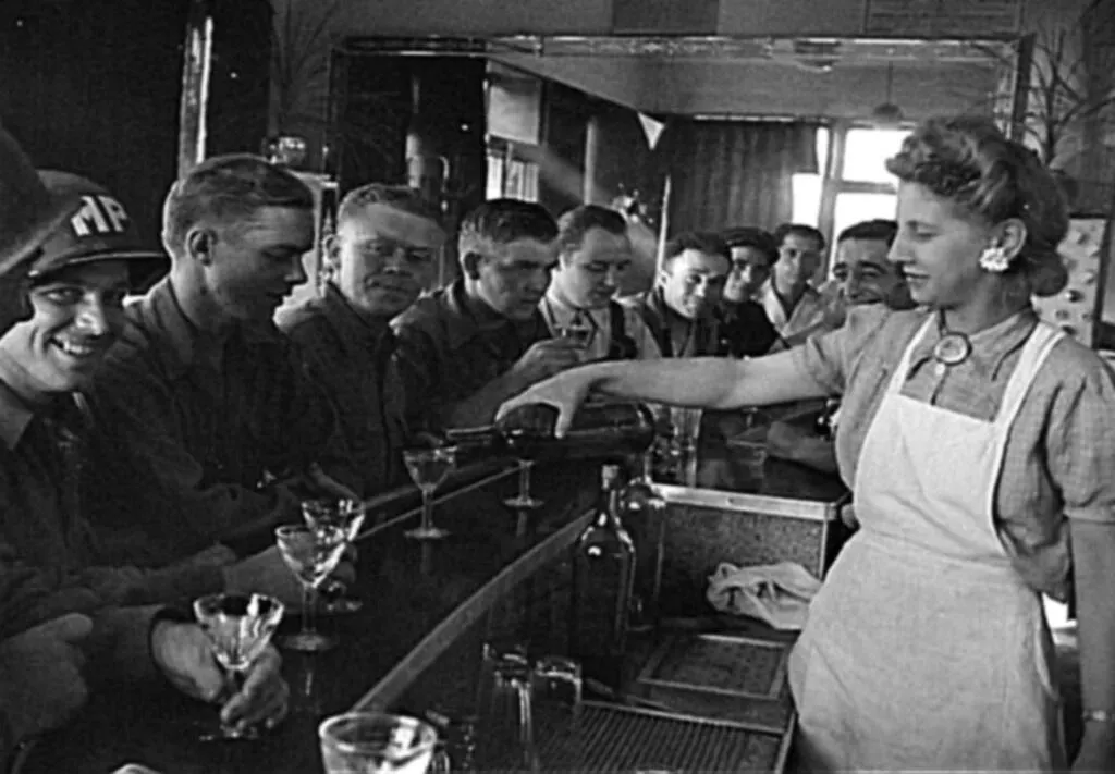 Des soldats américains se font servir à boire au Bar américain (aujourd’hui détruit), rue Gambetta, après la libération du Mans (Sarthe), en août 1944. © Collection privée