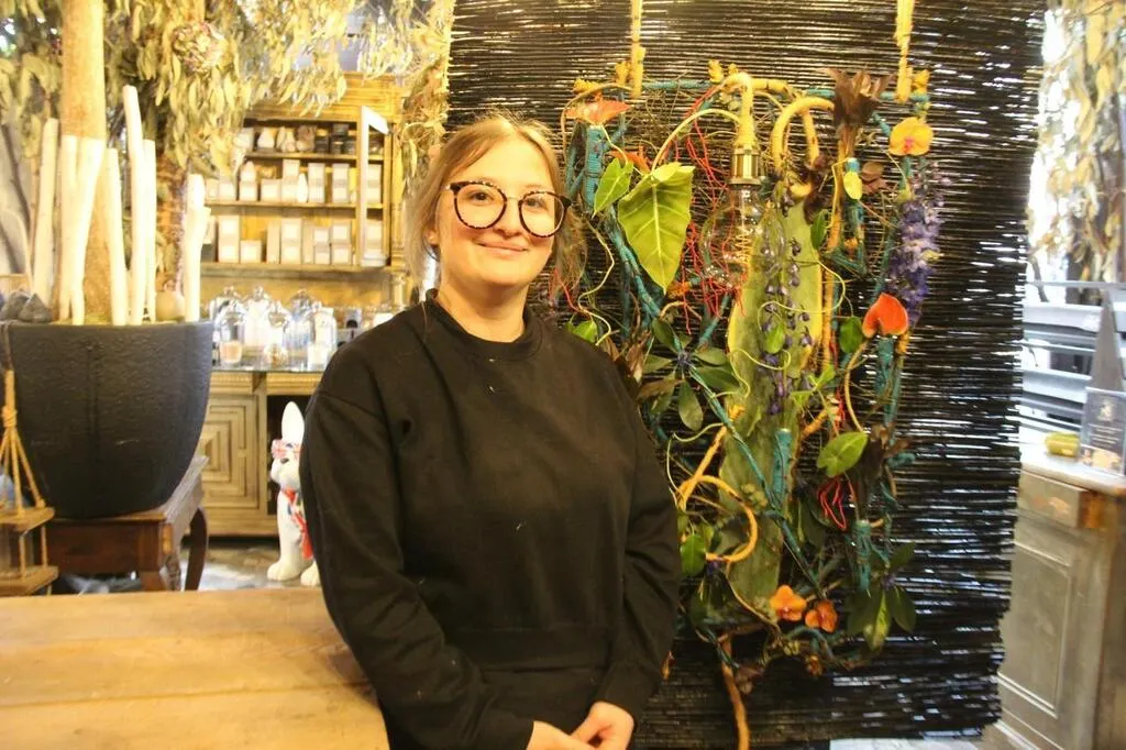 Noa Mallard, fleuriste en alternance à l’Atelier MB de Mikaël Besnardeau à La Flèche (Sarthe), a remporté l’or au concours départemental Un des meilleurs apprentis de France. Derrière elle, son applique murale végétale inspirée de l’univers du plasticien Julien Creuzet. © Ouest-France