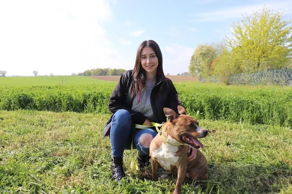 Basée au Lude, près de La Flèche (Sarthe), Coline Lesœur est éducatrice comportementaliste canin. Elle est ici avec Bella, un american staffordshire terrier de 5 ans, à qui elle a appris à canaliser son énergie. © Ouest-France