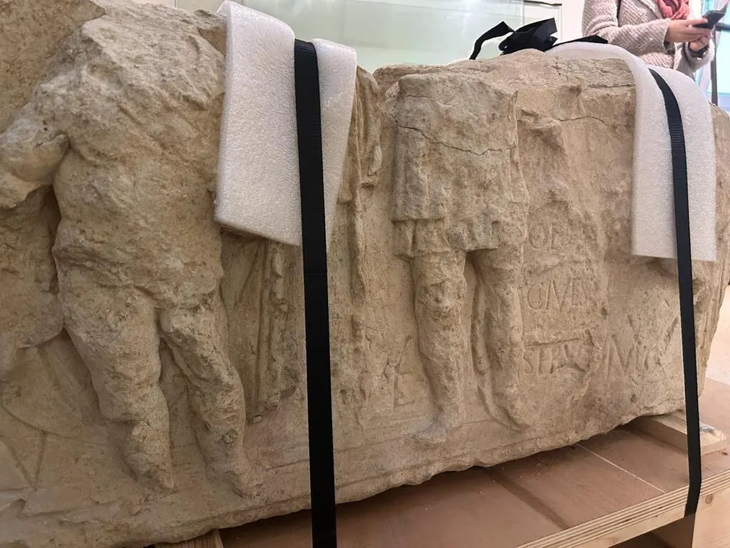 Découvert en 2007 sur le site archéologique de Mars Mullo, à Allonnes (Sarthe), l’autel romain était la dernière œuvre conservée au Centre d’études et de ressources archéologiques du Maine (Ceram). Ce mercredi 21 février 2024, il a été précautionneusement transporté jusqu’aux réserves des musées du Mans.