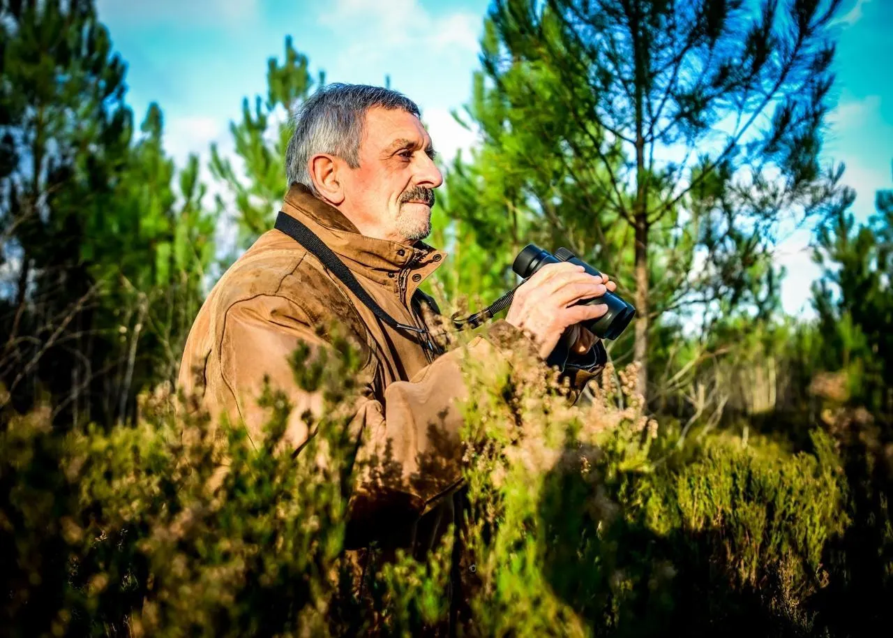 Le Mans, mercredi 3 décembre 2025. Gilles Paineau, président du Groupe sarthois ornithologique, observe les fauvettes présentes sur la lande du Mans et dont la population a atteint un niveau exceptionnel avec 400 couples recensés. © Le Maine Libre – Yvon LOUÉ