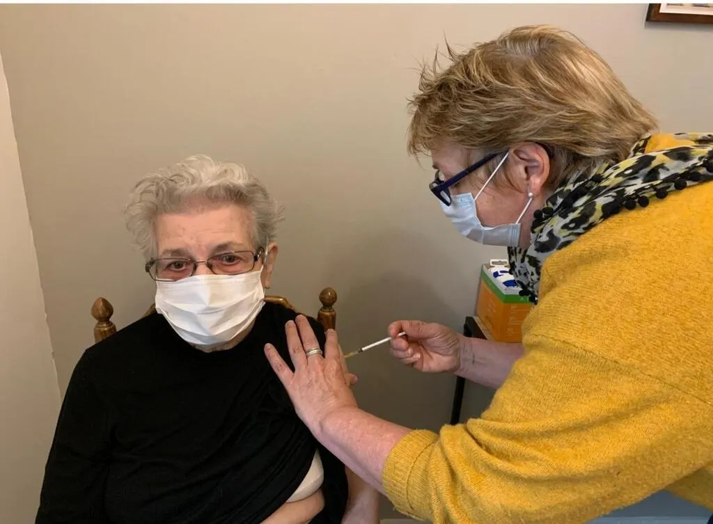 Yvonne Breton, Védaquaise de 99 ans, s’est fait vacciner à la pharmacie, samedi matin. © Ouest-France
