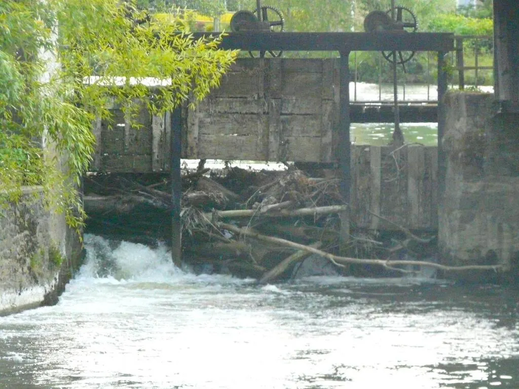 La pression de l’eau est forte sur l’écluse, obstruée par les embâcles © Le Maine Libre