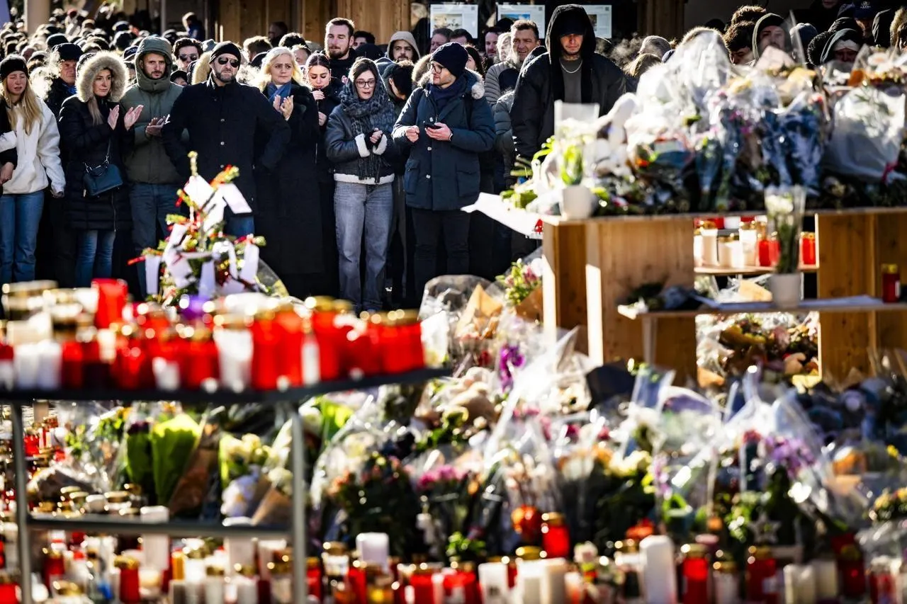 Des personnes en deuil se rassemblent autour de fleurs et de bougies pour commémorer les victimes de l’incendie de Crans-Montana, en Suisse, le 4 janvier 2026. © JEAN-CHRISTOPHE BOTT/EPA/MAXPPP
