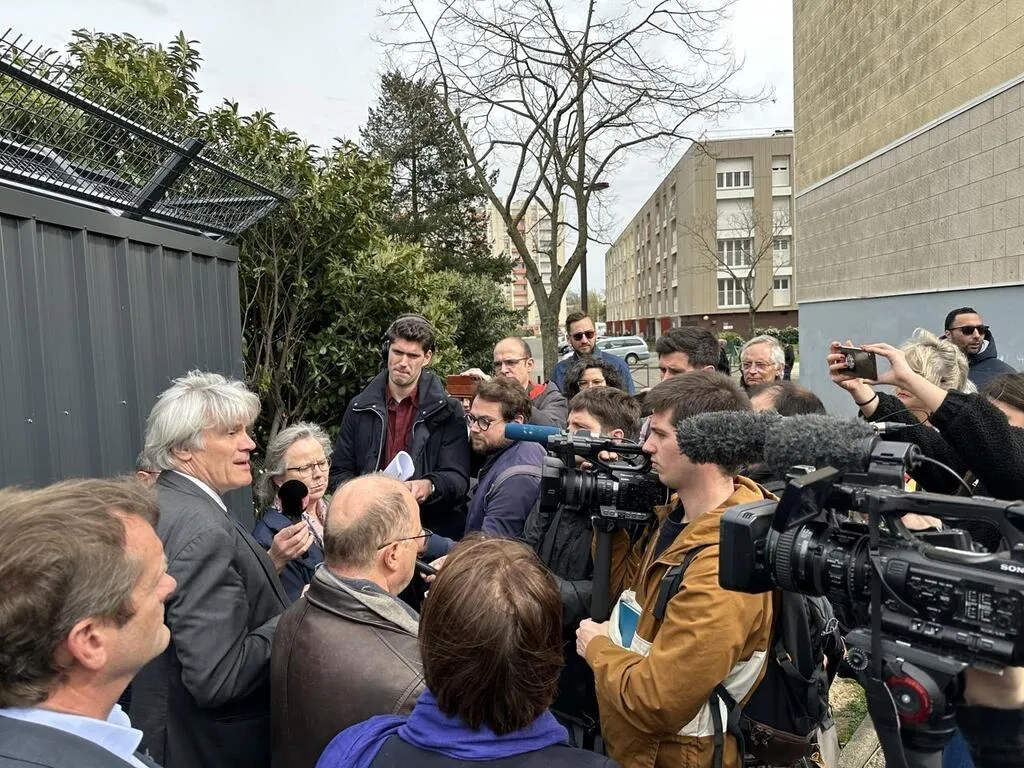 Opération de communication par les autorités locales sarthoises, ce mercredi 29 mars 2023. La procureure Delphine Dewailly, le préfet Emmanuel Aubry et le maire PS Stéphane Le Foll ont organisé une conférence de presse au pied d’immeubles du quartier des Sablons, au Mans (Sarthe), secoué, depuis juin 2022, par des tirs et un meurtre, sur fond de trafic de stupéfiants.