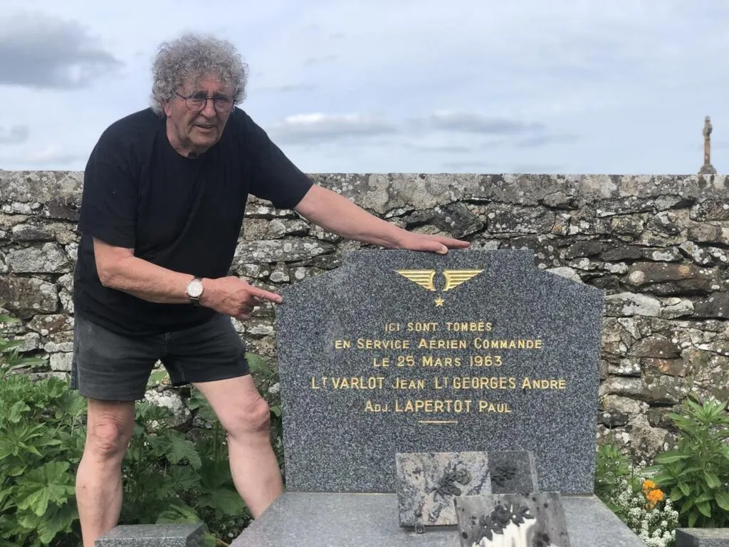 Neufchâtel-en-Saosnois, jeudi 12 mai 2022. Fernand Legeard, ici près de la stèle qui avait été érigée à l’endroit du crash de l’hélicoptère. Elle se trouve désormais dans le cimetière de la commune. © Maine Libre