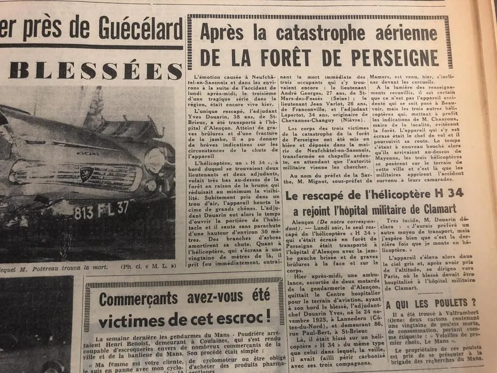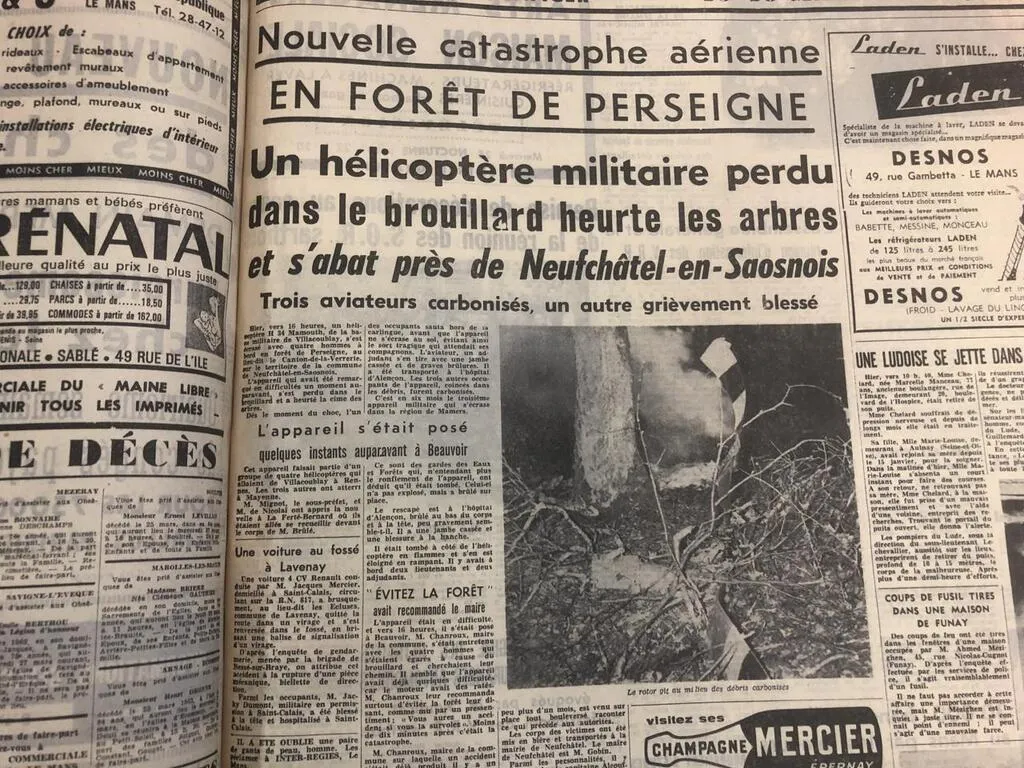 Début 1963, un avion puis un hélicoptère militaires se sont écrasés dans la forêt de Perseigne. En plein brouillard. Fernand Legeard, habitant de Neufchâtel-en-Saosnois, passionné d’histoire locale, s’est intéressé à ces deux faits divers dramatiques.