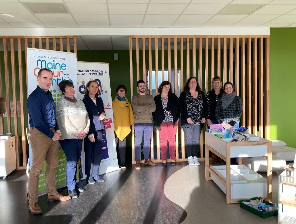 Le président de la communauté de communes Maine CÅ“ur de Sarthe, David Chollet (à gauche) et la directrice de la MDP, Isabelle Livache (au centre), accompagnés par les élus communautaires ont inauguré le nouvel Accueil de loisirs sans hébergement (ALSH) à Neuville-sur-Sarthe le jeudi 18 janvier 2024. © Ouest-France