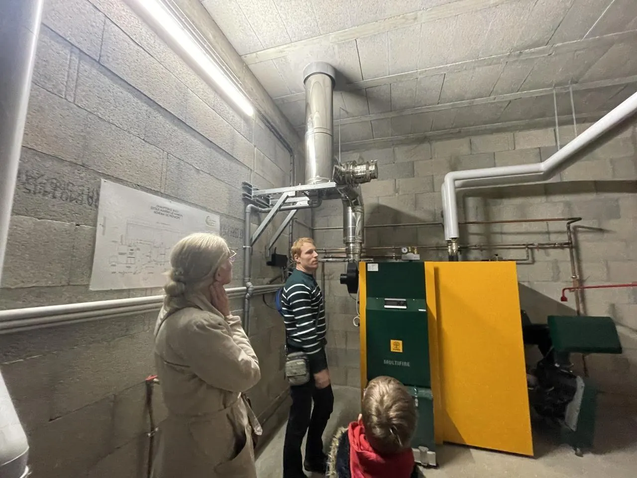 Le conseiller en énergie partagée Olivier Hennebert lors de l’inauguration (ici devant la chaudière à bois avec une enseignante et un élève). © Le Maine Libre