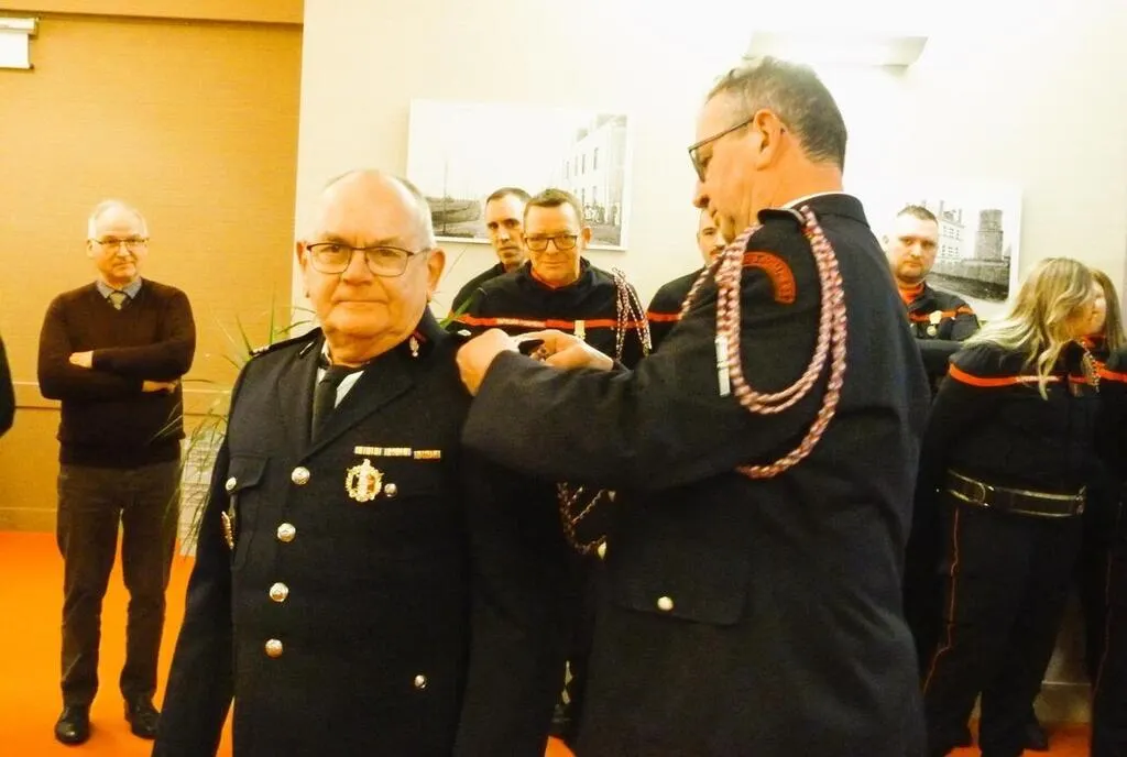 Le sergent-chef honoraire Gilbert Bruneau reçoit la fourragère des mains de Bruno Foulon, adjoint au chef du centre de secours de Montmirail-Gréez © Ouest-France.