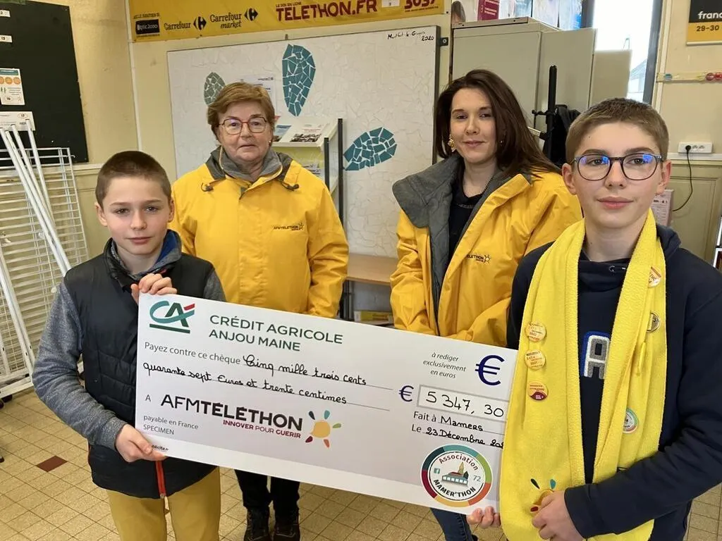 Mardi 24 décembre 2024, l’association Mamer’Thon, qui œuvre toute l’année à Mamers (Sarthe) et aux alentours, a remis un chèque de 5 347,30 € à l’AFM-Téléthon pour 2024.