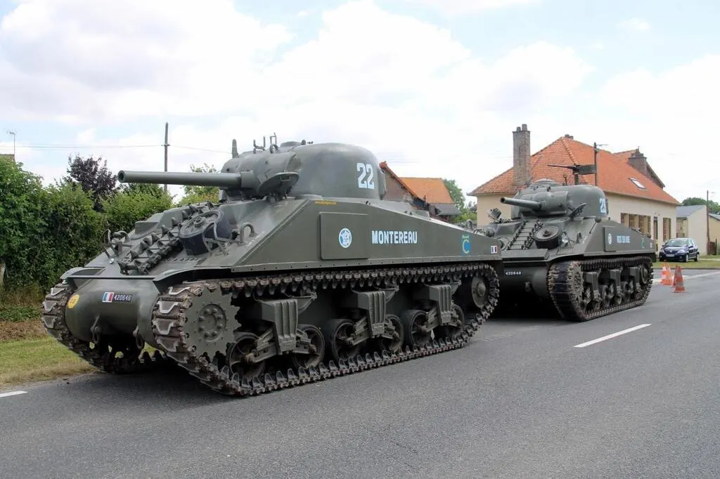 Le tank Sherman Montereau (au premier plan) est l’un des nombreux véhicules d’époque que pourra voir le public lors du passage de la colonne Leclerc à Sablé-sur-Sarthe mais aussi à Auvers-le-Hamon. © Colonne Leclerc