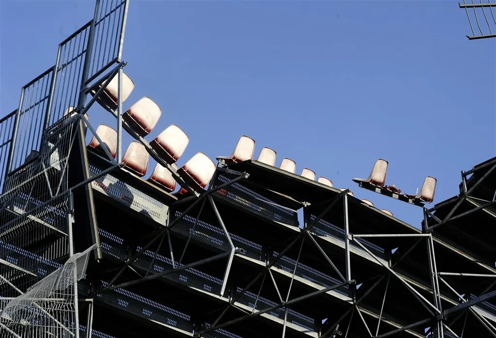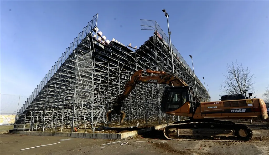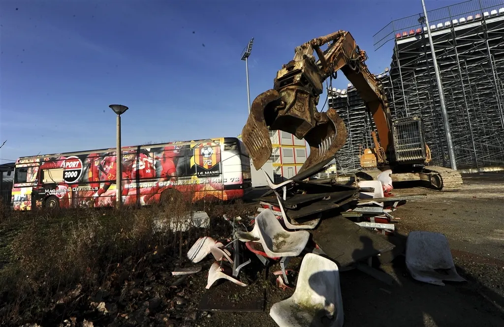 Haute d’une quinzaine de mètres et longue d’une bonne cinquantaine, elle n’a pas trouvé acquéreur après la fermeture du stade Léon Bollée. Elle pouvait accueillir 3580 personnes sur ses 2300 m2. Pour augmenter la capacité du stade, elle avait connu deux phases d’installation en 1998 puis en 2003 et avait fait l’objet d’une rigoureuse visite d’homologation. Mais maintenant, c’est du passé. Le stade Léon Bollée traîne ses souvenirs et se laisse un peu aller, à l’image de sa pelouse généreuse et de sa tribune SEM, amputée de centaines de fauteuils. Mais c’est ainsi. Le MMarena est né, Bollée est mort. Et c’est avec un bel appétit que la pelle mécanique dévore les structures métalliques de cette tribune Sud.