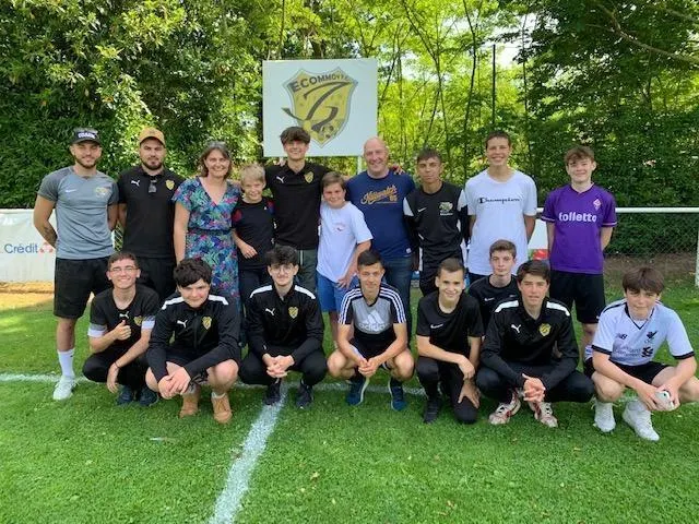 Andreas debout au centre, entouré de sa famille d’accueil et de ses amis du club de foot d’Écommoy © Le Maine Libre
