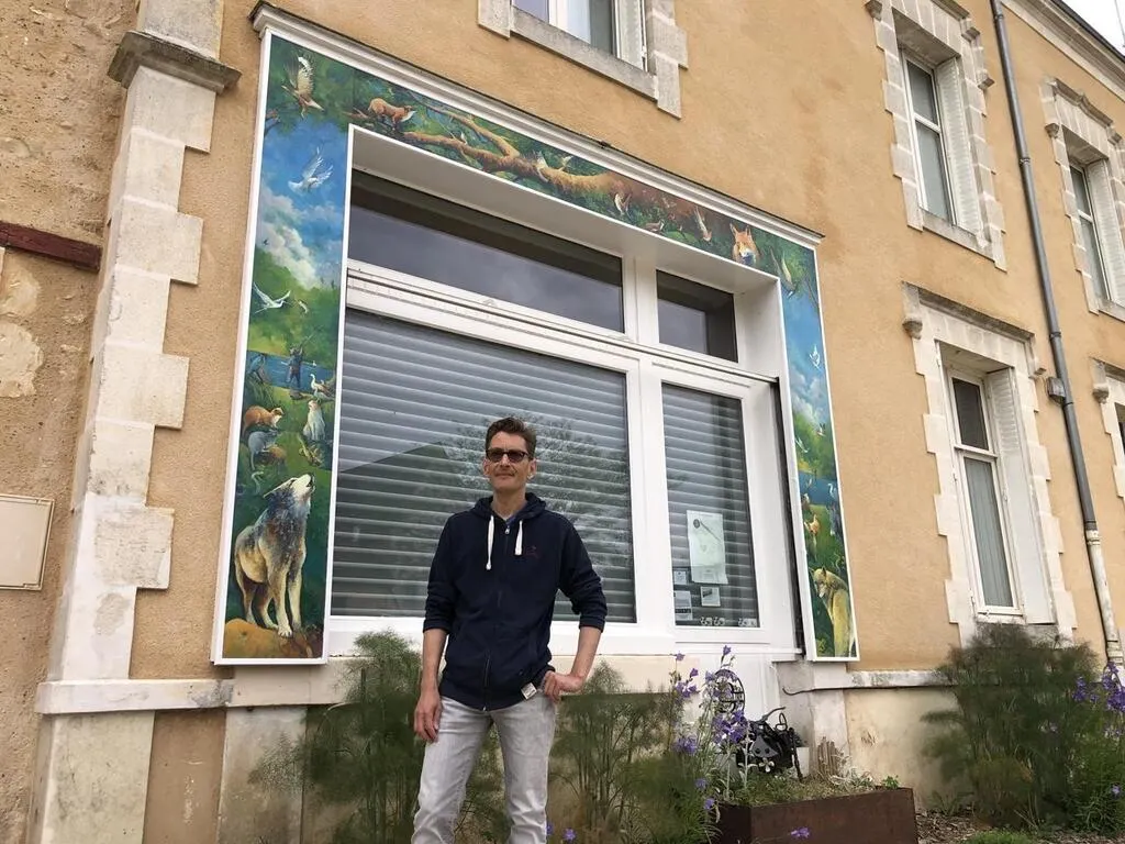 Stéphane Le Lay, artiste peintre installé à Asnières-sur-Vègre, s’est vu confier la réalisation de la fresque « L’arche des Proverbes » qui prend place sur le fronton de l’ancienne boulangerie, place Du Guesclin. © Ouest-France