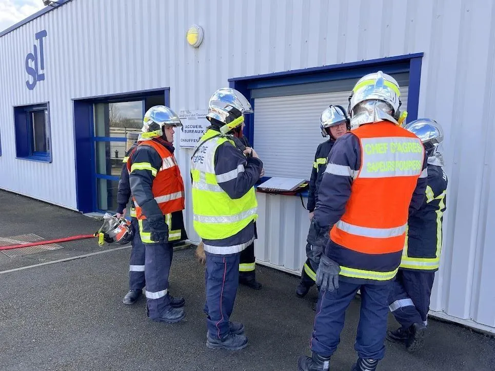 ManÅ“uvres des sapeurs-pompiers de Brûlon, Loué et Chantenay-Villedieu chez SLT (Service Logistique Transports), qui compte une quarantaine de salariés. © Le Maine Libre