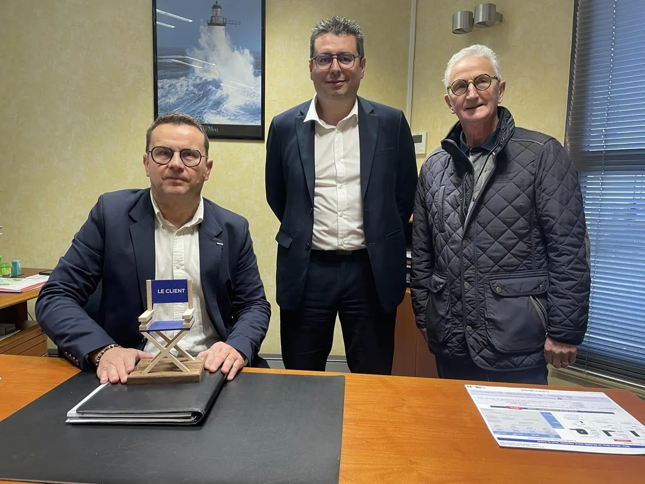 Sébastien Gillet (au centre) cède sa place à Jérôme Cherruault ici en compagnie d’Alain Tessier qui fut durant de nombreuses années le président de la caisse locale du Crédit Mutuel de Sablé-sur-Sarthe. © Ouest-France