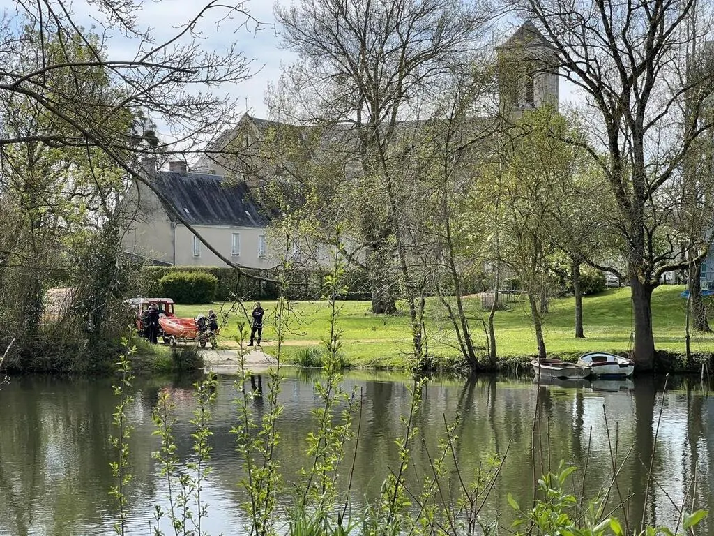 Le reflet dans le Loir du clocher de Sainte-Colombe marque l’endroit d’où l’ancienne cloche sonnerait sous l’eau. © Yanne Boloh