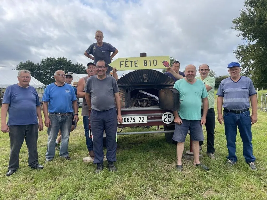 Henri Joly (troisième en partant de la droite) et les membres de l’association de protection de l’environnement malicornais, réunis autour du four à pain, organisent la 20e Fête bio, dimanche 25 août 2024. © Ouest-France