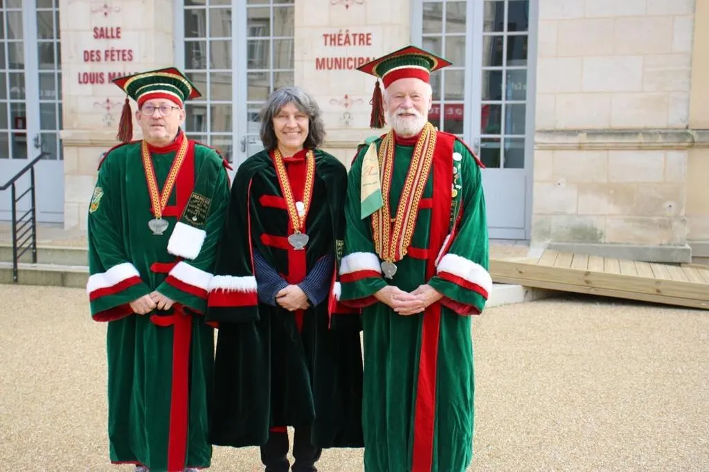Devant la salle Louis-Malle, Jean-Michel Étienne, Grand maistre (à droite), accompagné de Véronique Lesage et Jacques Aubry, hauts dignitaires. © Ouest-France