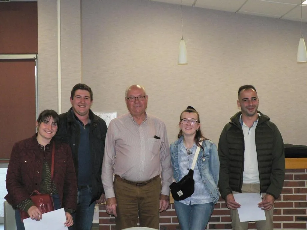 Les deux couples qui ont bénéficié de la subvention de 5 000 € chacun avec Francis Belluau, le maire, lors de la signature de la convention. © Ouest-France