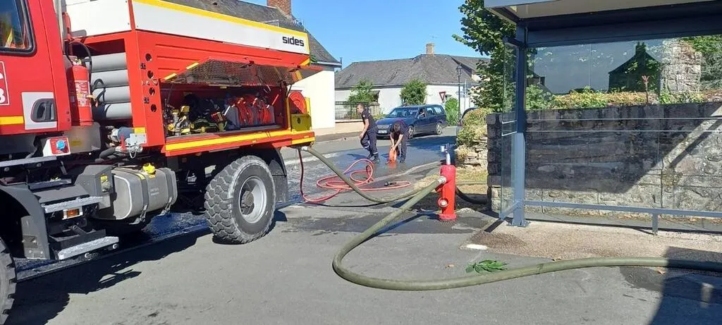 Les camions de pompiers en train de se recharger en eau à Pezé-le-Robert (Sarthe), ce vendredi 5 août 2022. © Ouest-France