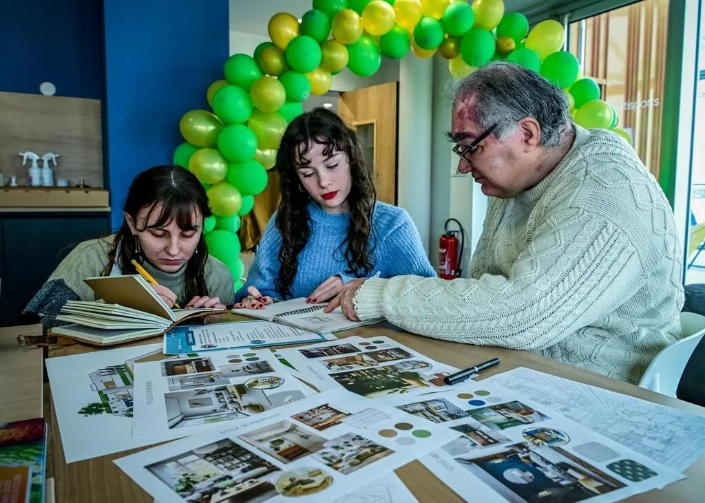 Florie-Anne Gardy, animatrice de ce projet, et les trois futurs résidents réfléchissent à l’aménagement de la résidence à Sablé-sur-Sarthe. © Le Maine Libre - Yvon LOUÉ