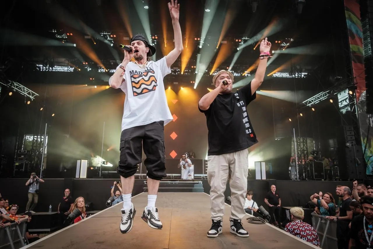 Les MCs Blabbermouf et Troy Berkley avec le groupe L’Entourloop en concert au festival La Nuit de l’Erdre (Loire-Atlantique) en juillet 2025. © Archives Simon TORLOTIN / Ouest-France