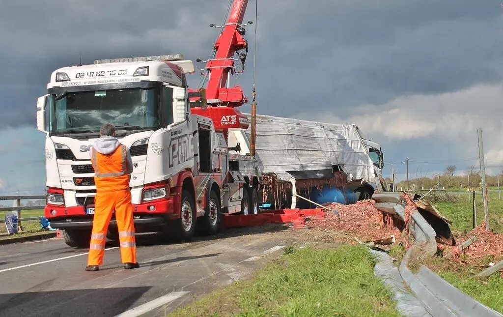 La personne au volant, une femme, n’a pas été blessée. Elle aurait perdu le contrôle de son véhicule après un contact entre sa remorque et la glissière. Son poids lourd est resté plusieurs heures sur le flanc. Il a été relevé par une équipe de dépanneurs spécialisée de Maine-et-Loire vers 14 h 30.