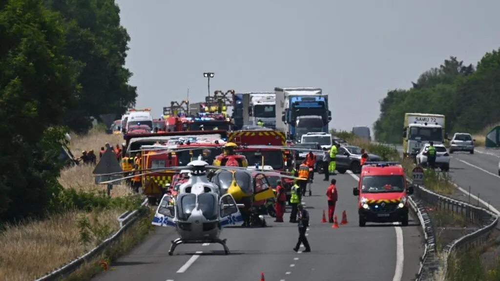 Une centaine de pompiers se sont déplacés sur l’accident mortel de car près de Degré. © Le Maine Libre - Denis LAMBERT