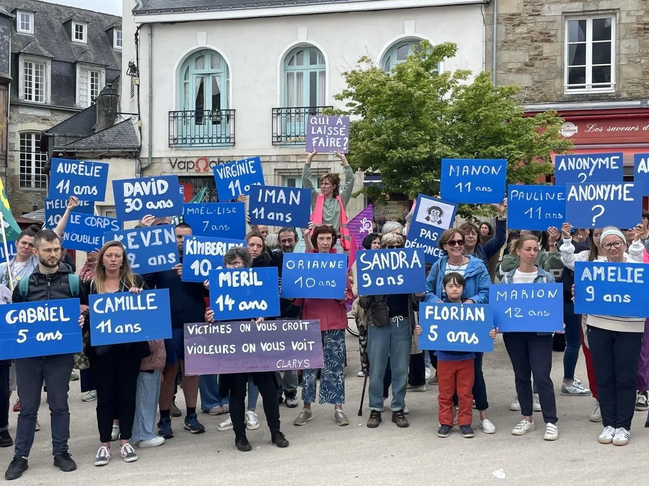 Moment d’émotion, lors du procès à Vannes, lorsque furent brandis une quarantaine de panneaux avec les prénoms et les âges des victimes de Joël Le Scouarnec. © Ouest-France