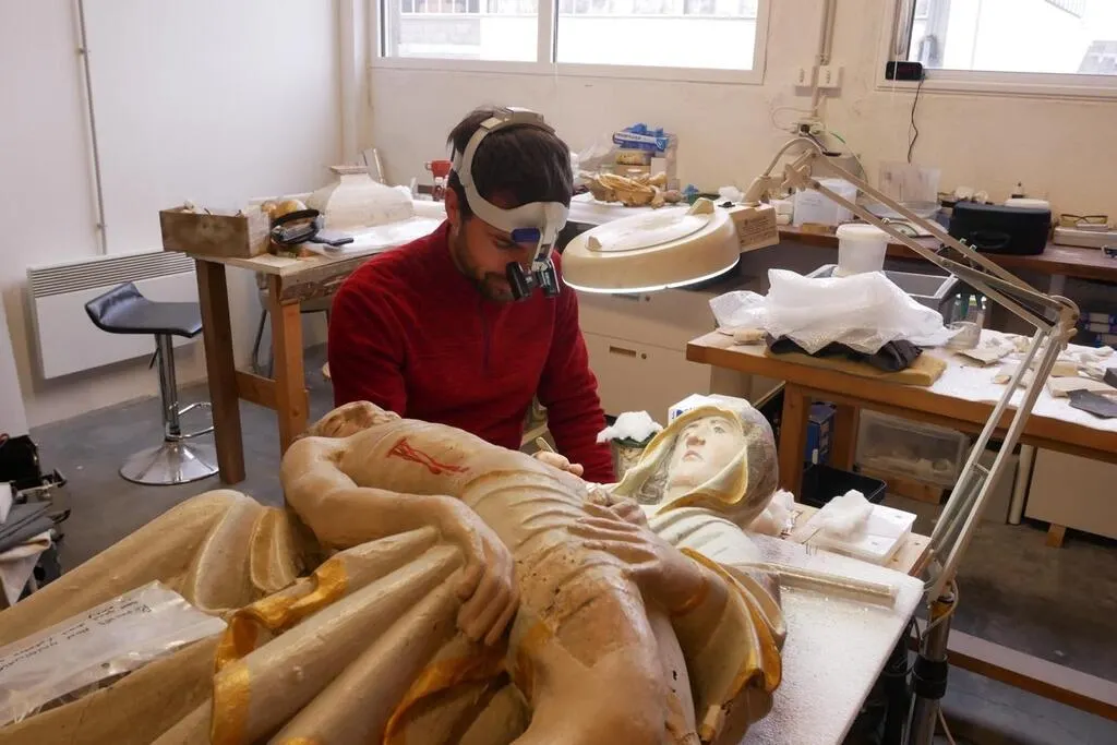 Au printemps dernier, l’œuvre a donc quitté l’église du village pour prendre la direction de l’atelier de Florian Gaget, un conservateur restaurateur de sculptures basé à Nantes. Dans un premier temps, le conservateur doit mettre au jour la peinture originale.