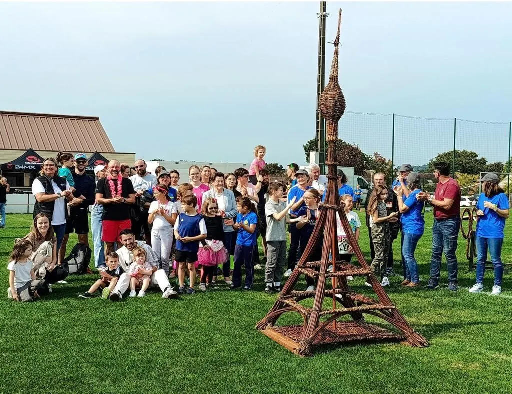 L’emblème de la commune a été porté par de nombreux habitants de tous âges, de la mairie jusqu’au terrain sportif à côté du stade, où il a été remis sur la tour Eiffel en osier réalisée par l’association de lavannerie. © Le Maine Libre
