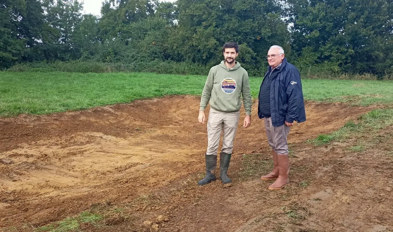 Joël Juillet, maire adjoint (à droite), avec Manuel Plantive, écologue, devant l’une des futures mares. © Ouest-France