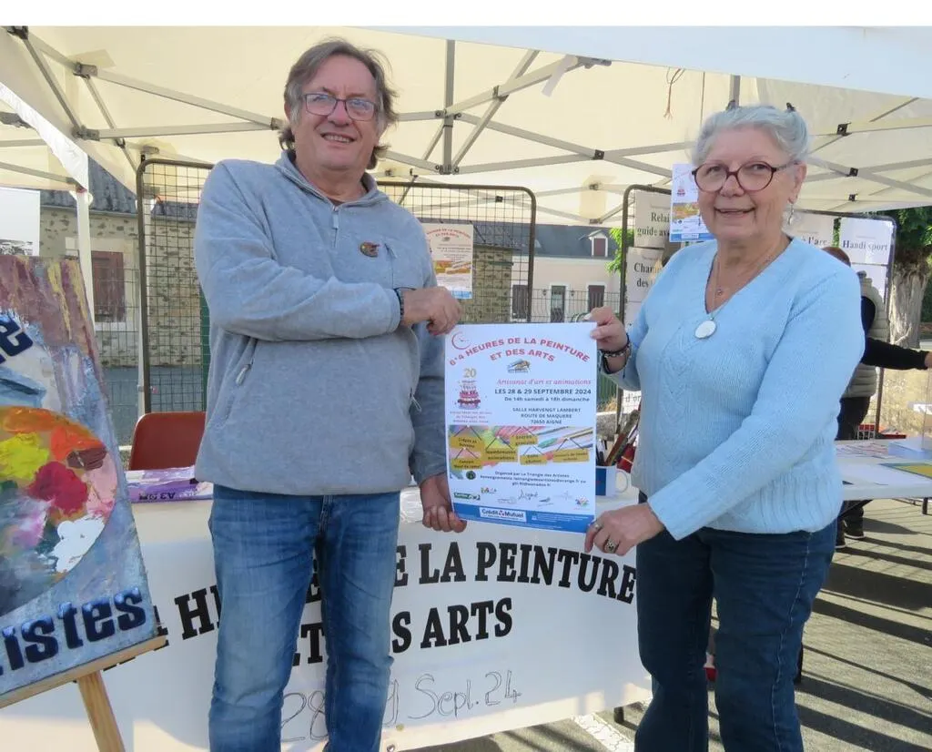 Ghislaine Flotte, présidente, Bernard Gueffier, trésorier, de l’association Le Triangle des Artistes présentent l’affiche des 6 x 4heures de la peinture et des arts édition 2024. © Le Maine Libre