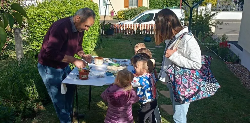 espèrent les jardiniers. Ces derniers avaient bien préparé la rencontre en proposant différents ateliers, Bernard présentait tout un assortiment de graines alors que Michel gérait les différents sols, sable, argile, terre, compost avec vers de terre. Quant à Lucette et Jean-Yves, ils faisaient découvrir leur jardin après avoir disposé des légumes murs en bout des sillons,  ainsi les enfants font la relation avec les plantsÂ