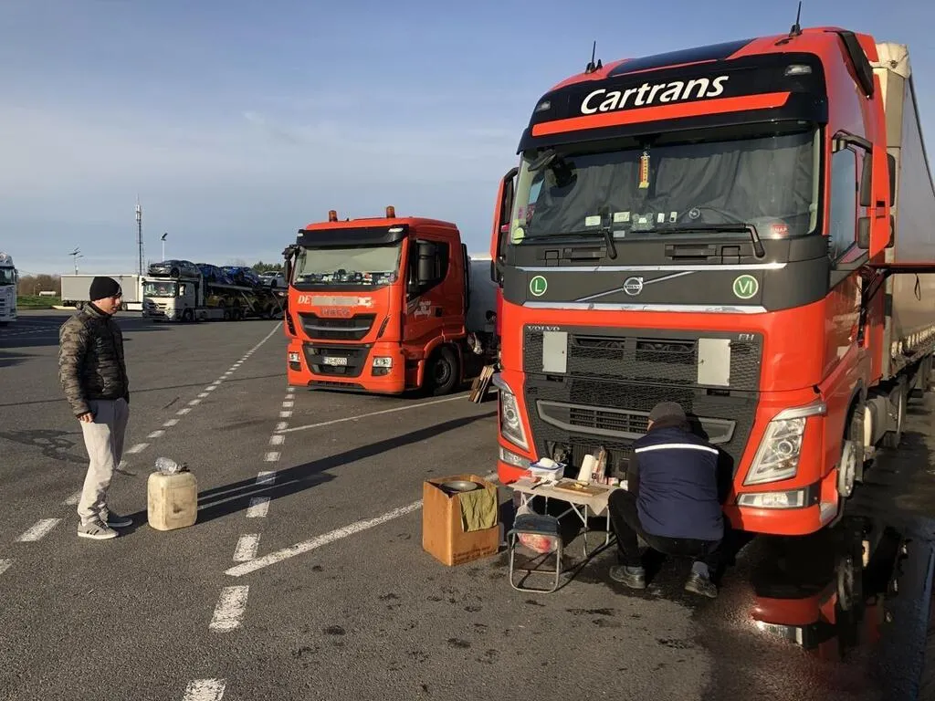 Au pied de la calandre d’un mastodonte de la route, d’autres chauffeurs, polonais cette fois-ci, ont dressé une petite table de camping et attendent leur tour pour prendre leur douche.
