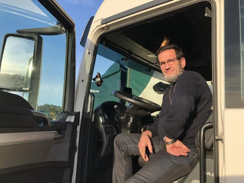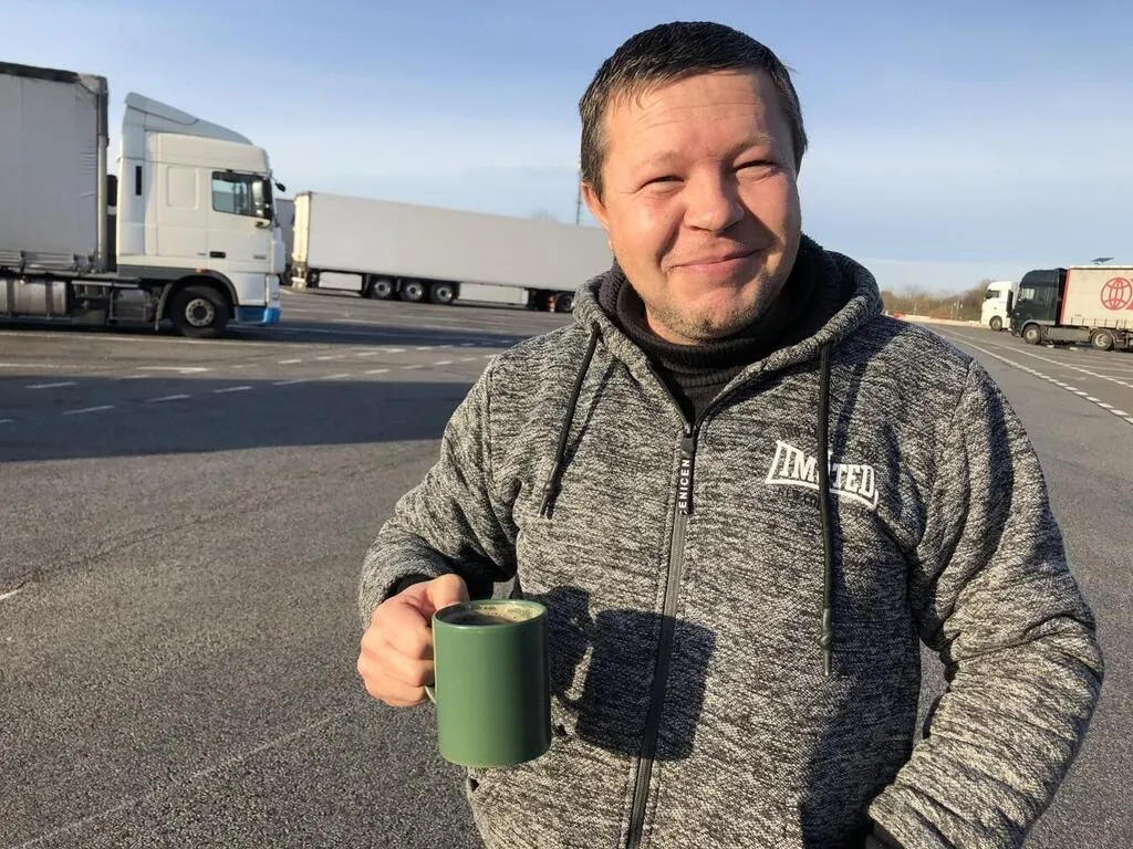 Un mug de café chaud à la main, un routier russe se réveille tout doucement sur l’aire de Sargé Le Mans nord, ce samedi 11 janvier. Ouest-France