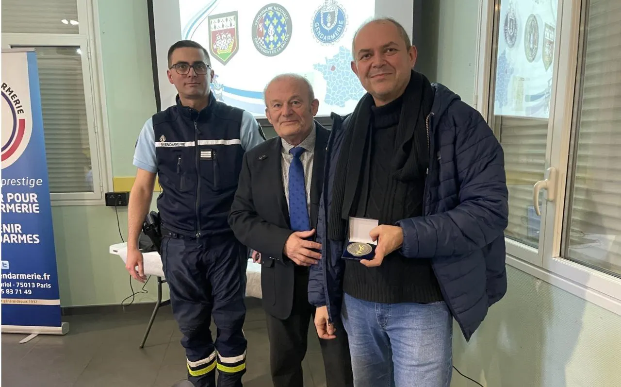 Alain Lefranc a remis la médaille des amis de la gendarmerie à la ville d’Allonnes représentée par Cyril Guilbaud. © Le Maine Libre