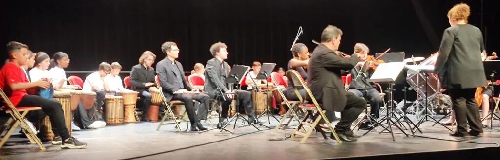 Les élèves aux percussions ont accompagné Zahia Ziouani pour ce tour du monde musical © Le Maine Libre