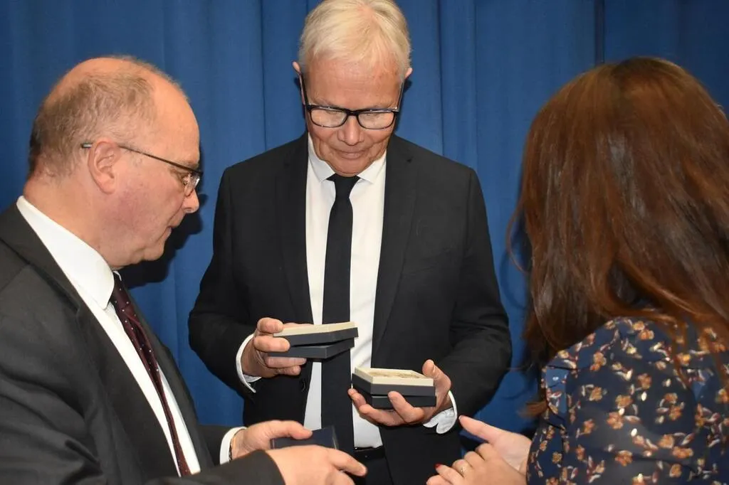 Emmanuel Aubry, préfet de Mamers, remet la médaille de maire honoraire à Joël Méténier. © Le Maine Libre