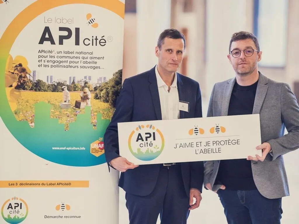 Denis Assier, maire, et Romain Hutereau, deuxième adjoint, présentent le label APIcité. © Le Maine Libre