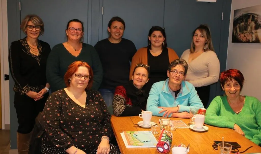 Céline Chanteloup, présidente, (debout, 2e à droite), accompagnée des membres du bureau et bénévoles, et d’Anne Noyer, directrice de l’école, (debout, à gauche). © Ouest-France