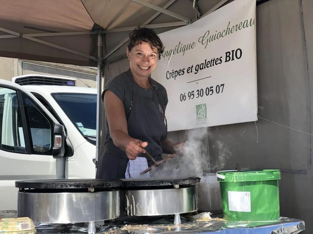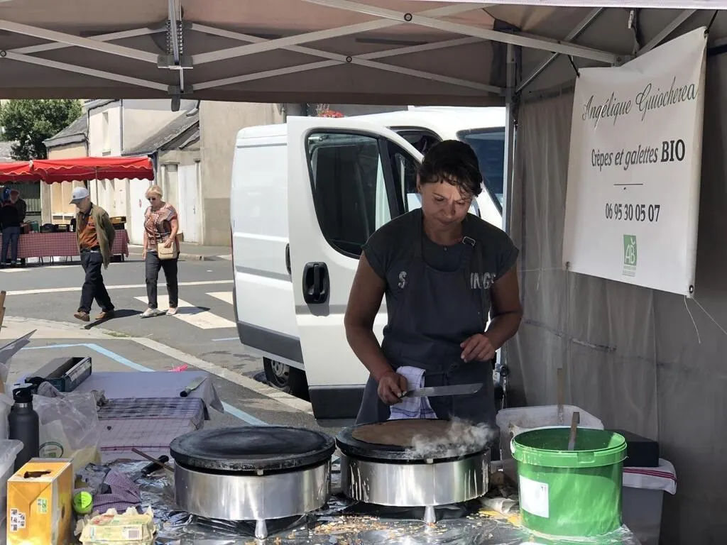 Trouver des crêpes et des galettes bios et locales au marché de La Flèche (Sarthe), c’est possible grâce à Angélique Guiochereau. Si elle a lancé son activité il y a tout juste un an, elle n’est pas une novice pour autant. Avant sa reconversion professionnelle, elle était maraîchère et écumait déjà les marchés des environs, dont celui de La Flèche.