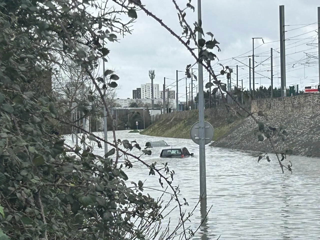 photo dans le chemin du bas, une rue qui mène à la déchetterie de la prairie-de-mauves, deux voitures piégées par la crue. cette artère qui longe la voie ferrée est devenue un canal.  ©  ouest-france