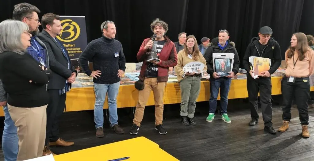 Il est 17 h 30 ce samedi et le salon BD Mania vit sa fin de première journée d’ouverture. C’est l’heure de la remise des prix aux lauréats des prix Ville d’Arnage, qui récompense des auteurs, et les gagnants du prix BD Mania organisé pour ses lecteurs par la médiathèque. Les gagnants du prix BD Mania sont Greg Souchon, Noam Cadoret et Jean-Christophe Duport. Tous trois ont reçu en cadeau un exemplaire dédicacé de l’album Air T2, de Philippe Pelaez et Francis Porcel, qu’ils avaient élu comme leur préféré parmi la sélection.