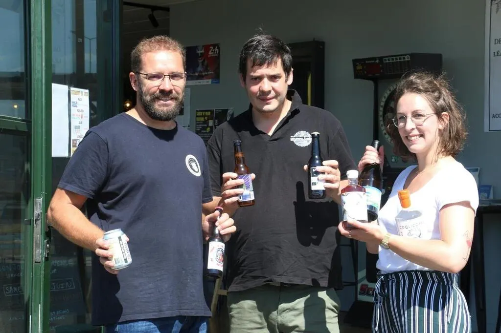 De gauche à droite, Julien Derenne et Julien Alcoverro, à la tête du Local à Bières à Arnage (Sarthe), et Léa Etrillard, gérante du bar-cave à vins Du vin et des copains. Ce samedi 18 juin 2022, ils accueillent la deuxième édition du Sarth’N’Beer Festival. © Ouest-France